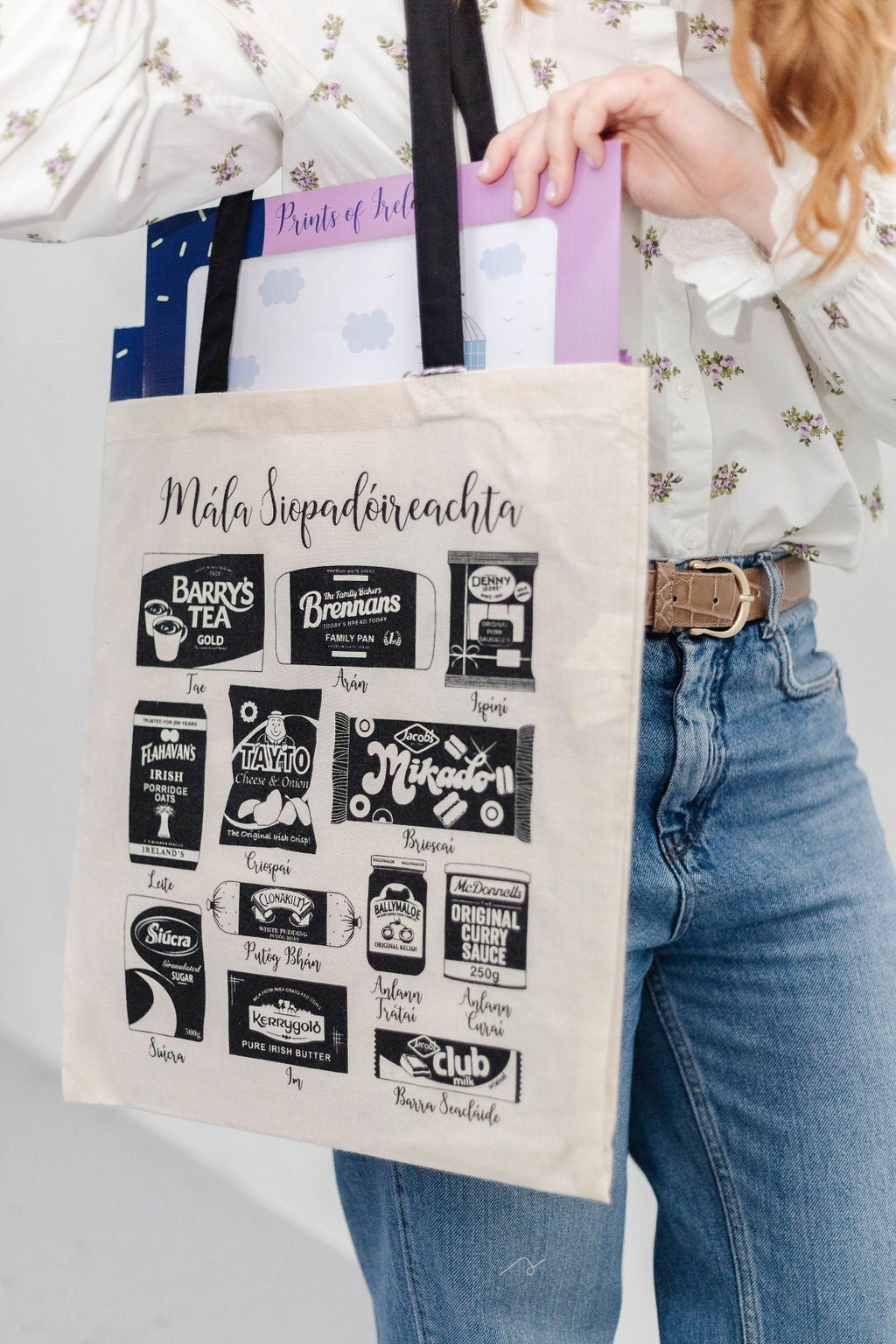 Irish groceries design featuring: Barry's Tea Bags, Brennans Bread, Denny Sausages, Flahavan's Porridge, Tayto Crisps, Jacob's Mikado, Siúcra, Clonakilty Pudding, Ballymaloe Relish, McDonells Curry Sauce, Kerrygold Butter, Jacob's Club Milk.