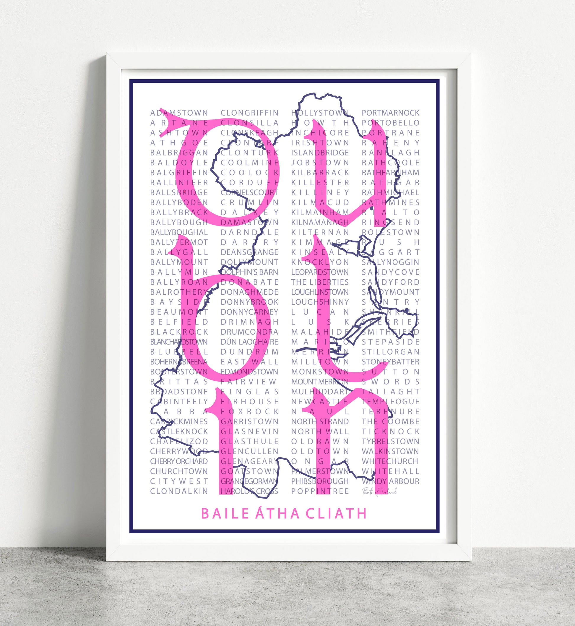Dublin Towns Print including including alphabetically listed towns around county Dublin.